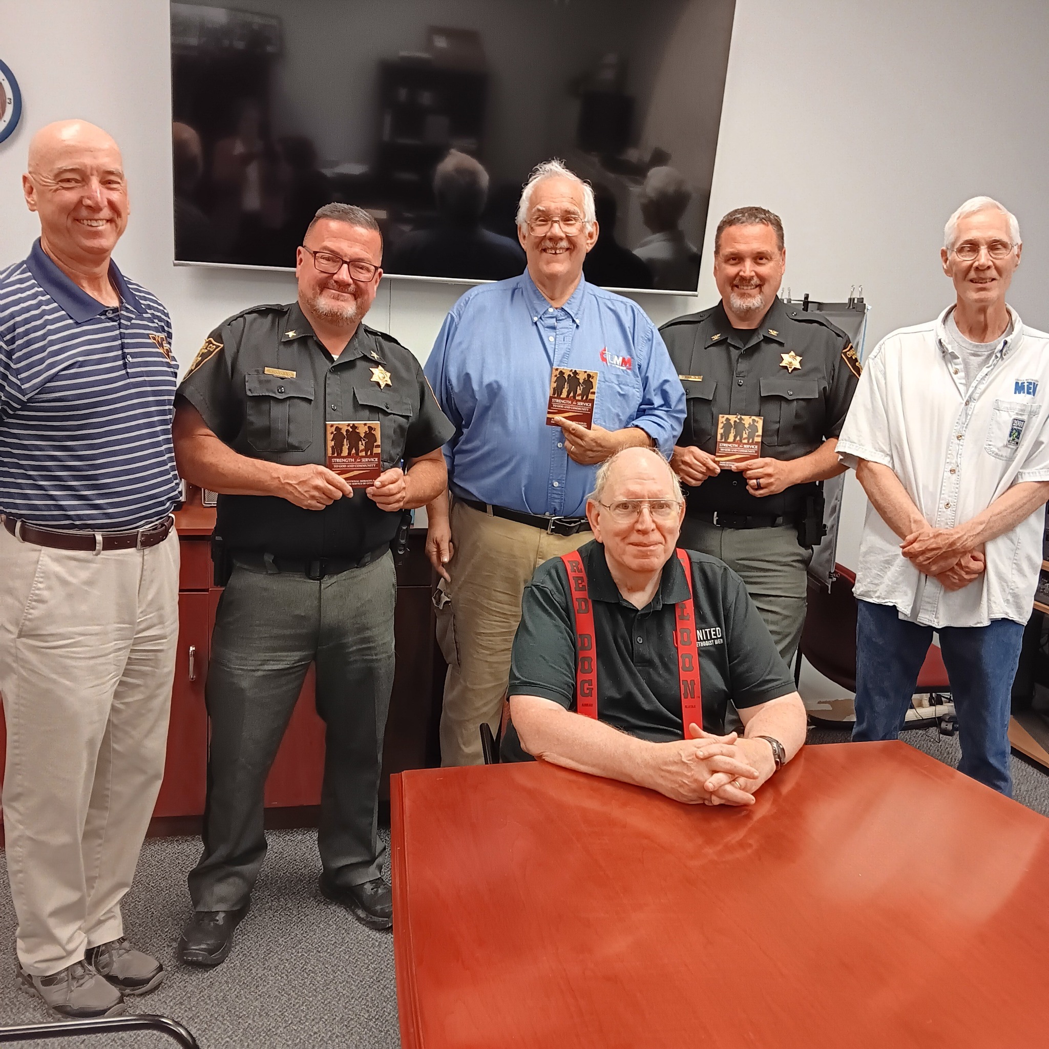 Pleasant Hill United Methodist Men and the West Virginia Conference delivered Strength for Service Books to Ohio County Sheriff pass out to deputies. Pictured are District Superintendent Neil Leftwich, Sheriff Nelson Croft, W.V. Conference President Wayne Custer, Chief Deputy Lewis Kent, Pleasant Hill United Methodist Men President George Cunningham, Seated Jeff Sterling. These are first responders for the flood in Triadelphia.